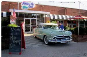 Converted from one of the original automobile dealerships in Franklin, the Motor Company Grill is a 50’s themed diner located on Main Street in historic downtown. Upon walking through the brick entrance where the original garage door was located, you can choose to sit in either their movie-themed dining room or their music-themed dining room Their menu features traditional diner favorites like soups, sandwiches, and salads. Additionally, their music-themed dining room features an authentic soda fountain with ice cream and milkshakes, complete with red leather bar stools.