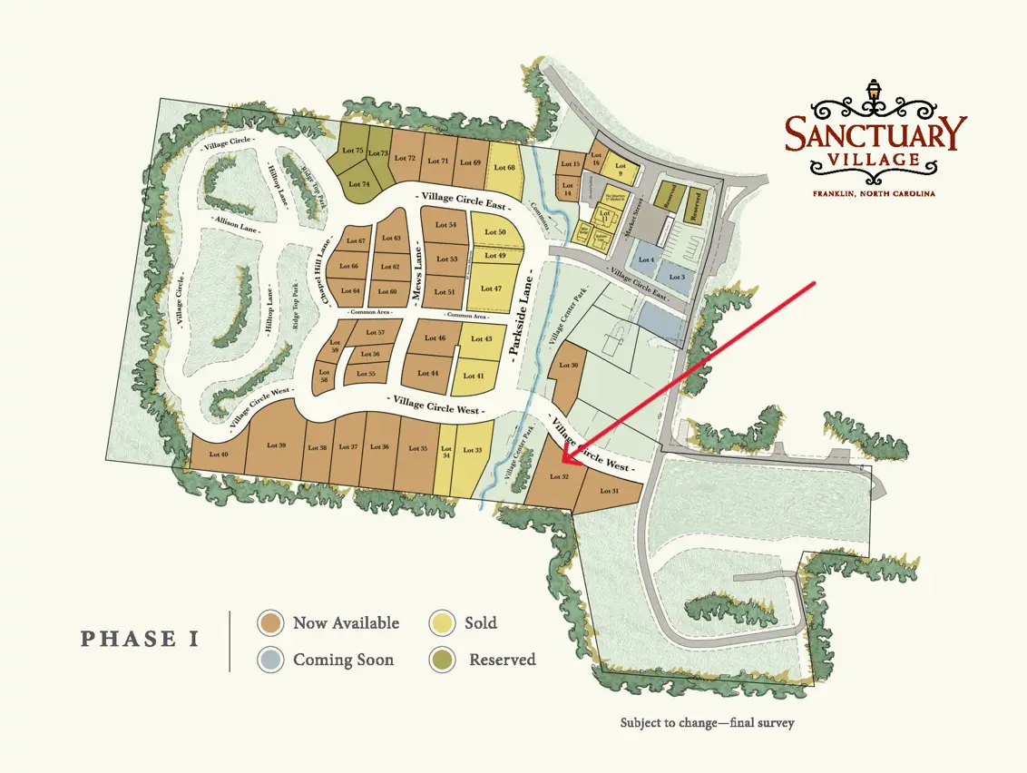 Lot 32 at Sanctuary Village offers an exceptional opportunity — an oversized homesite by a creek in downtown Franklin. Perfectly situated across from a beautiful newly completed home. This spacious lot combines the charm of creek side living with the convenience of a connected, small-town lifestyle. Ready to build with underground utilities, natural gas, and high-speed internet connectivity in place!